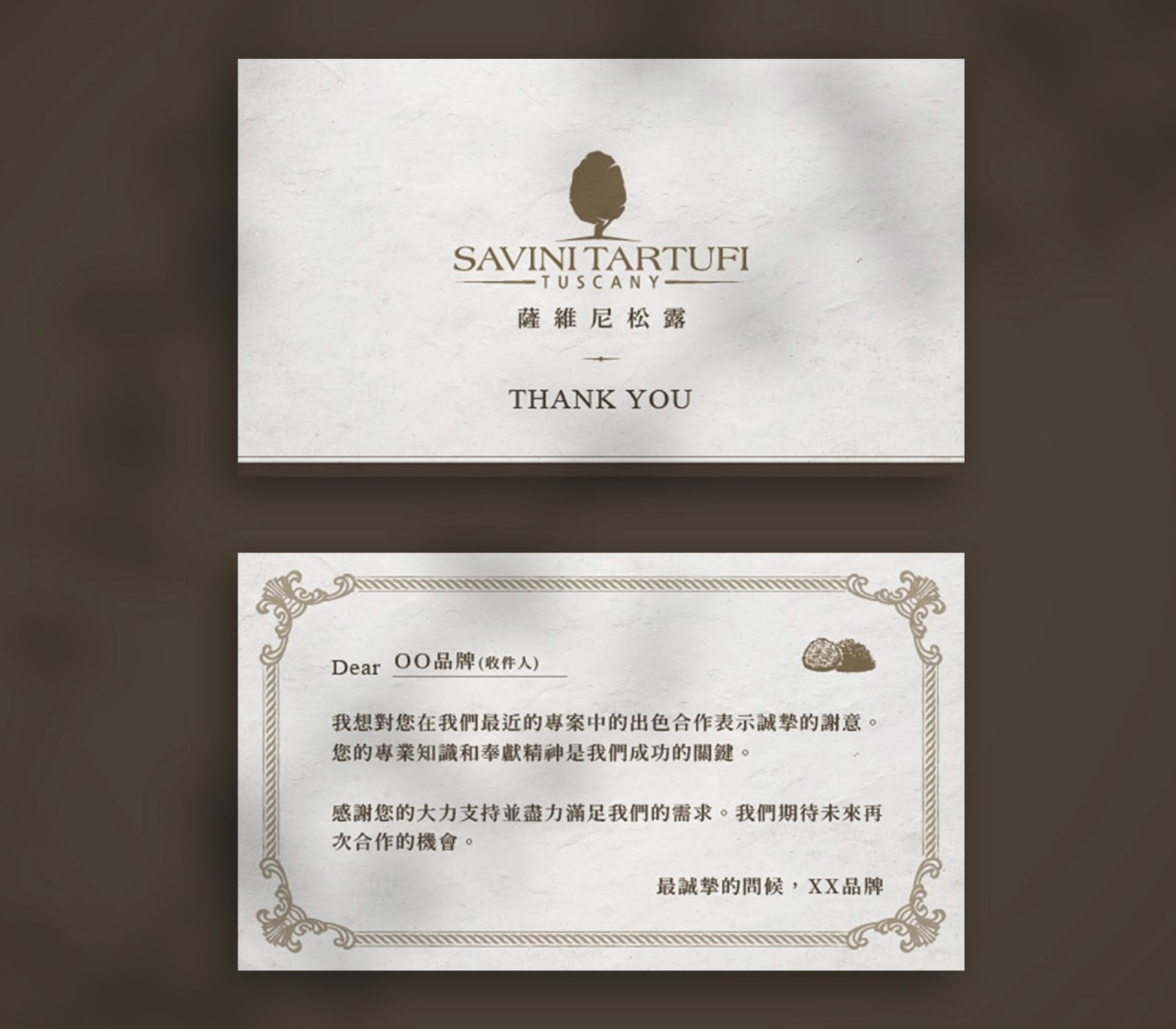 隨禮附上的專屬謝卡,展現出企業的用心與細緻,給人專業、重視關係的態度,有助提升企業的整體形象。